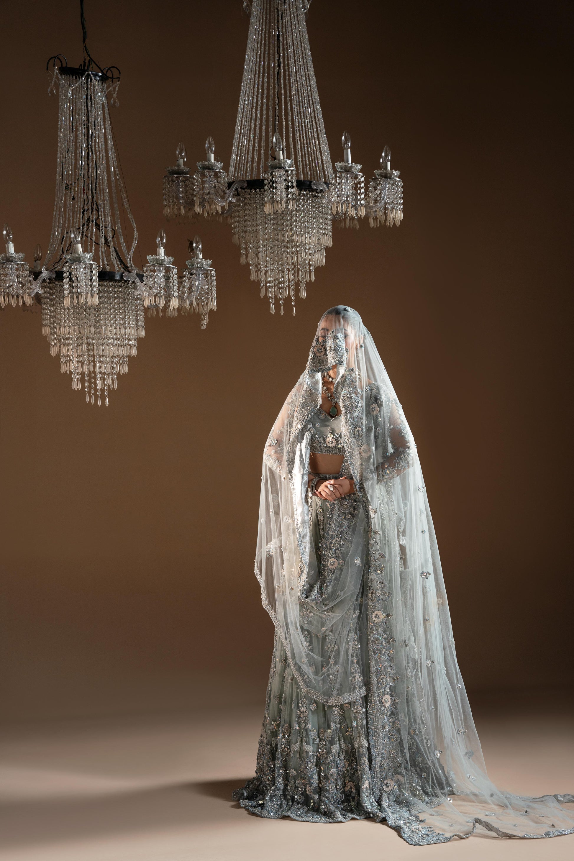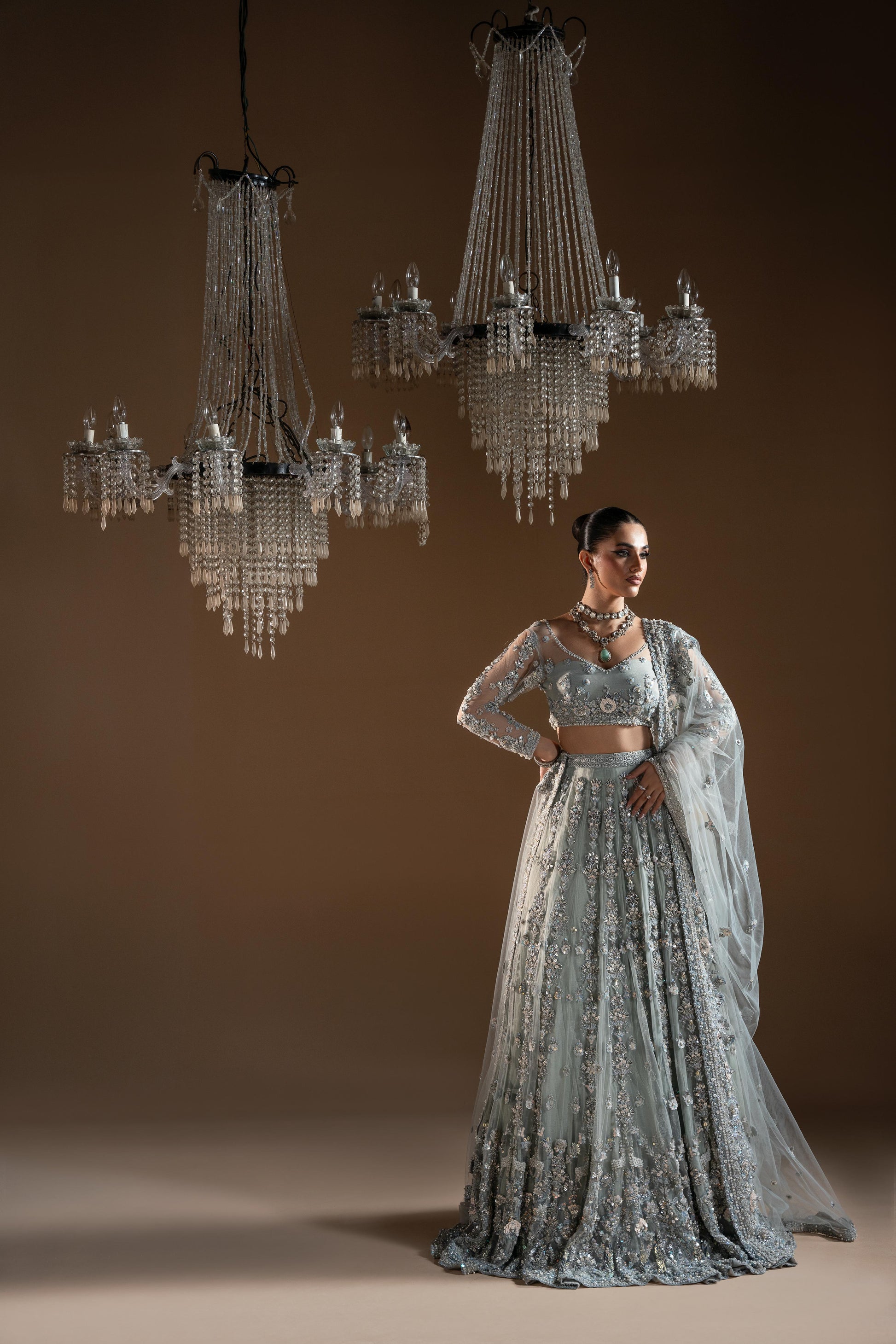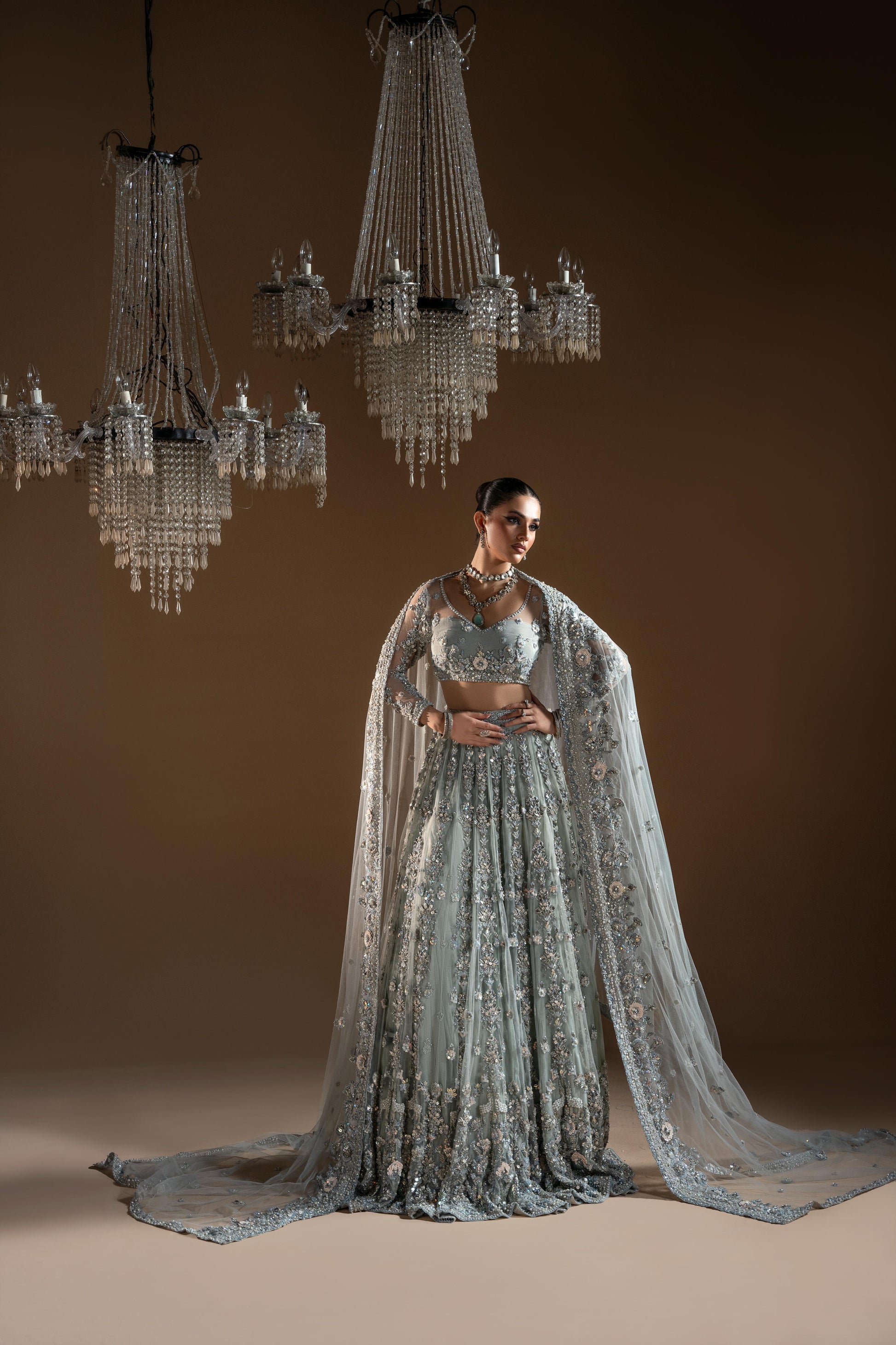 Pure net adorned with silver zari and resham embroidery, heavily bling with adda work, sequins, naqshi, dabka heavily embellished with crystals and pearls. Lined with premium silk . Paired with heavily embellished net dupatta.