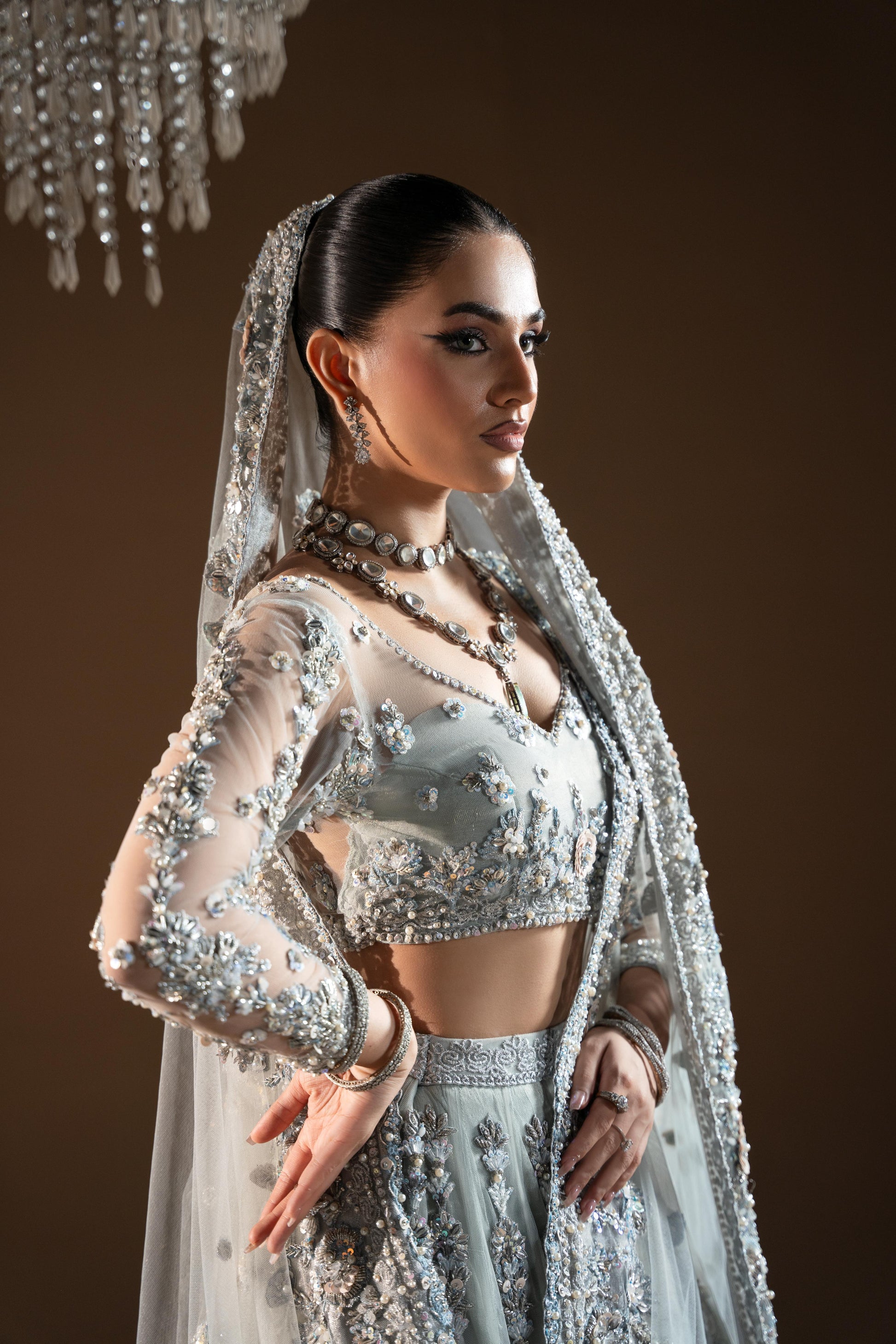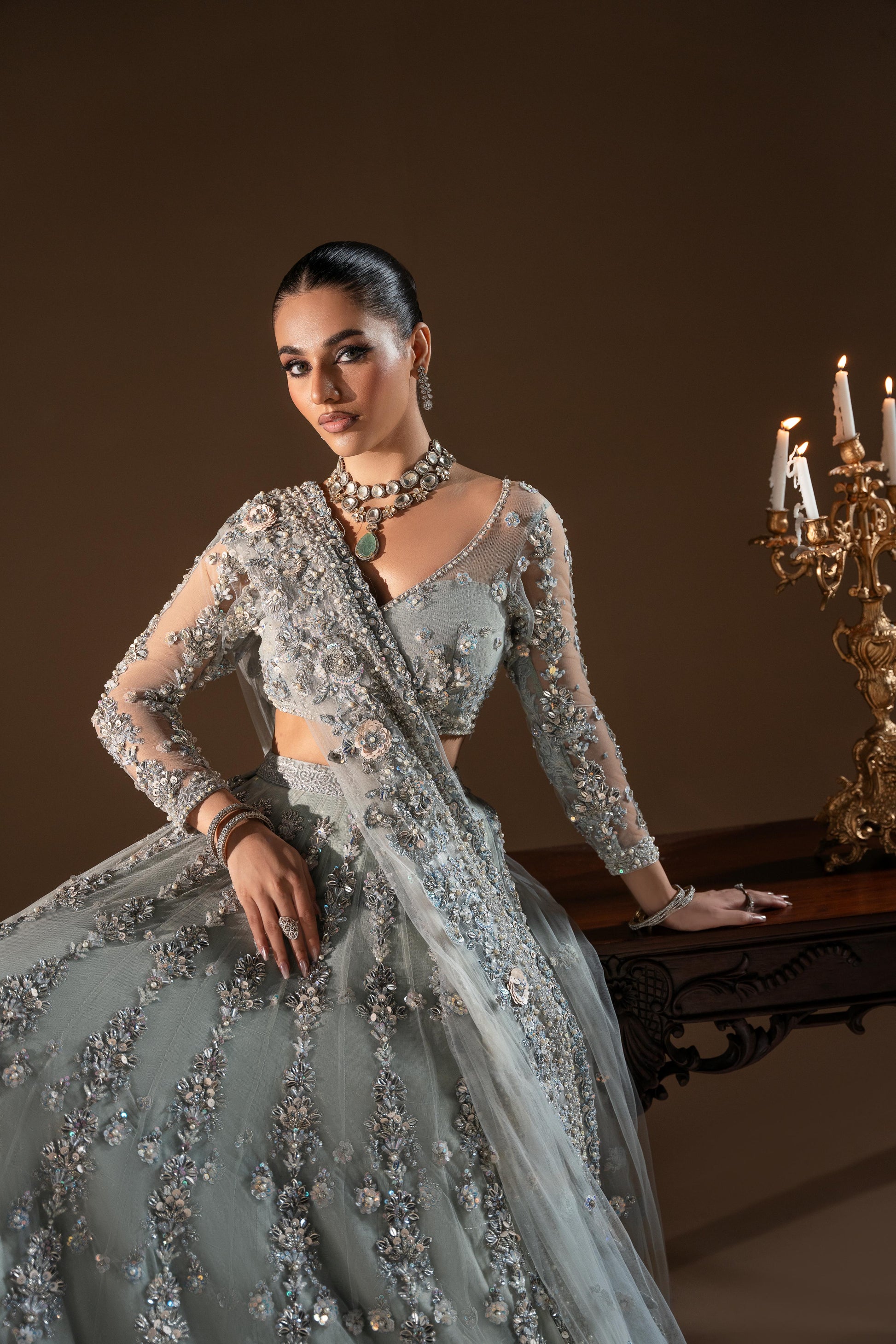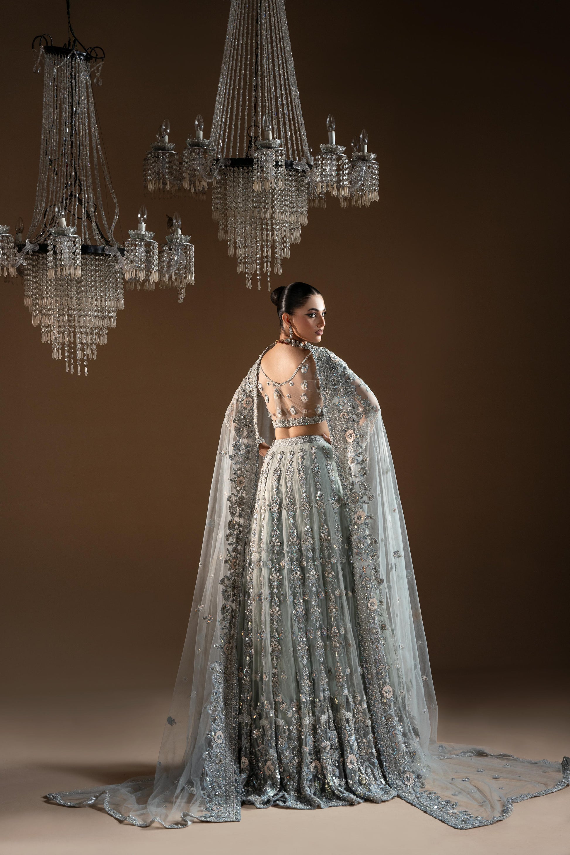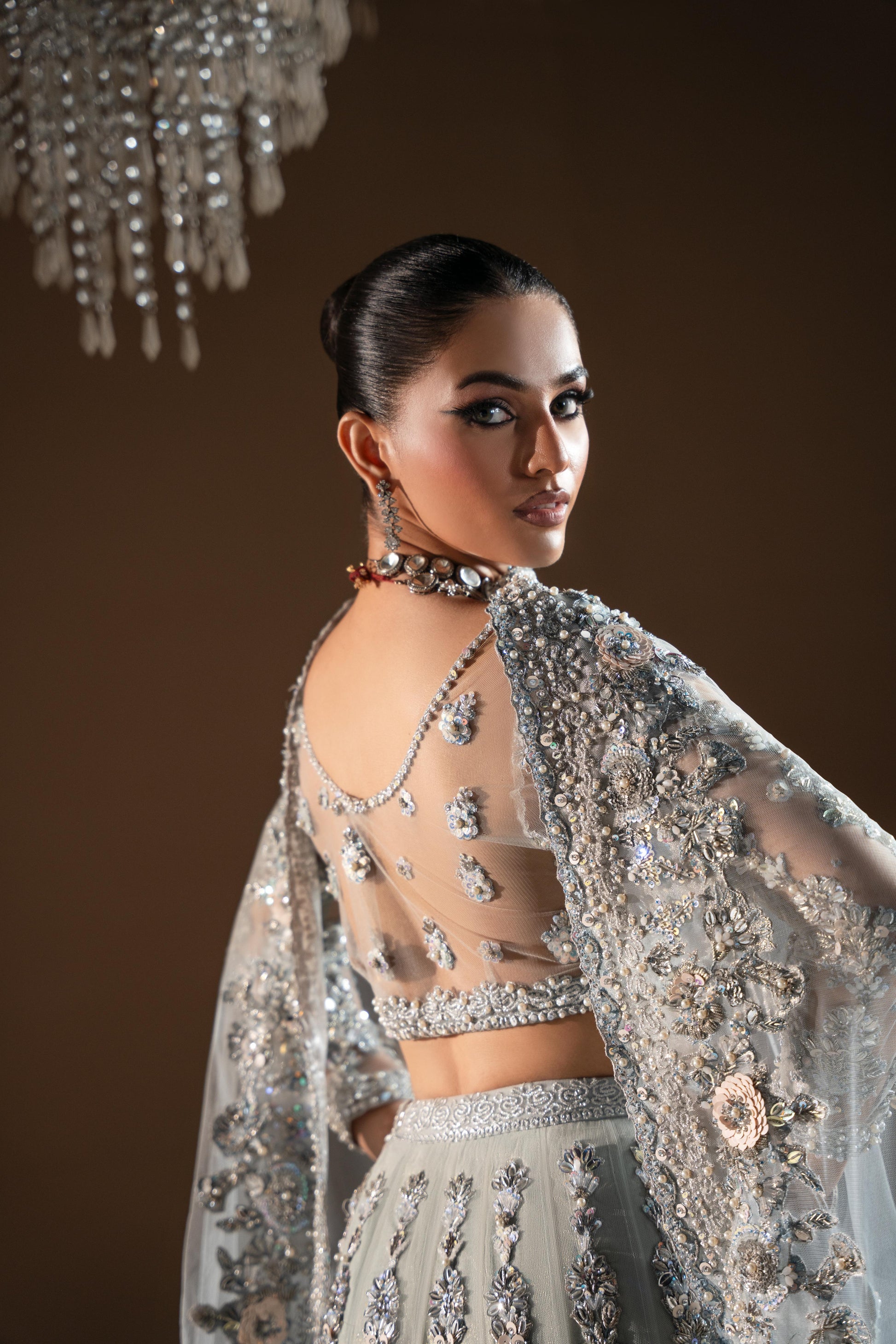 Pure net adorned with silver zari and resham embroidery, heavily bling with adda work, sequins, naqshi, dabka heavily embellished with crystals and pearls. Lined with premium silk . Paired with heavily embellished net dupatta.