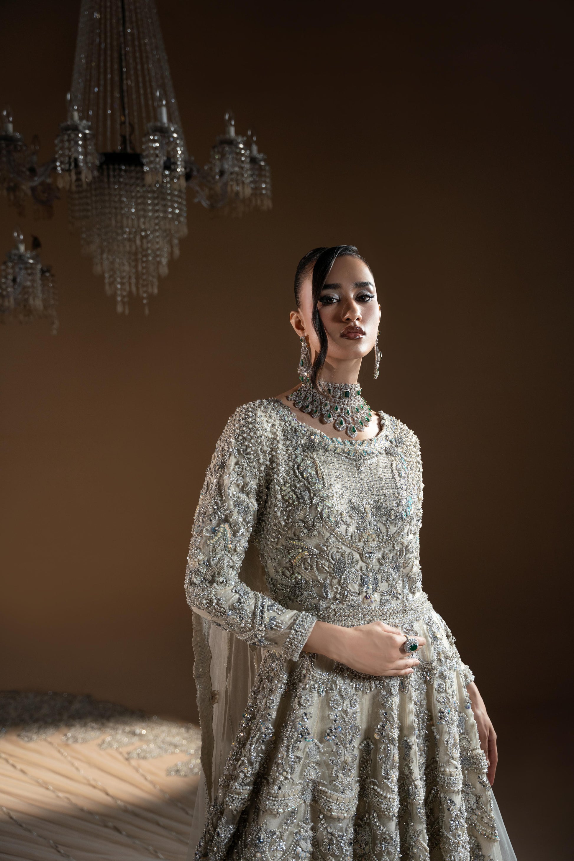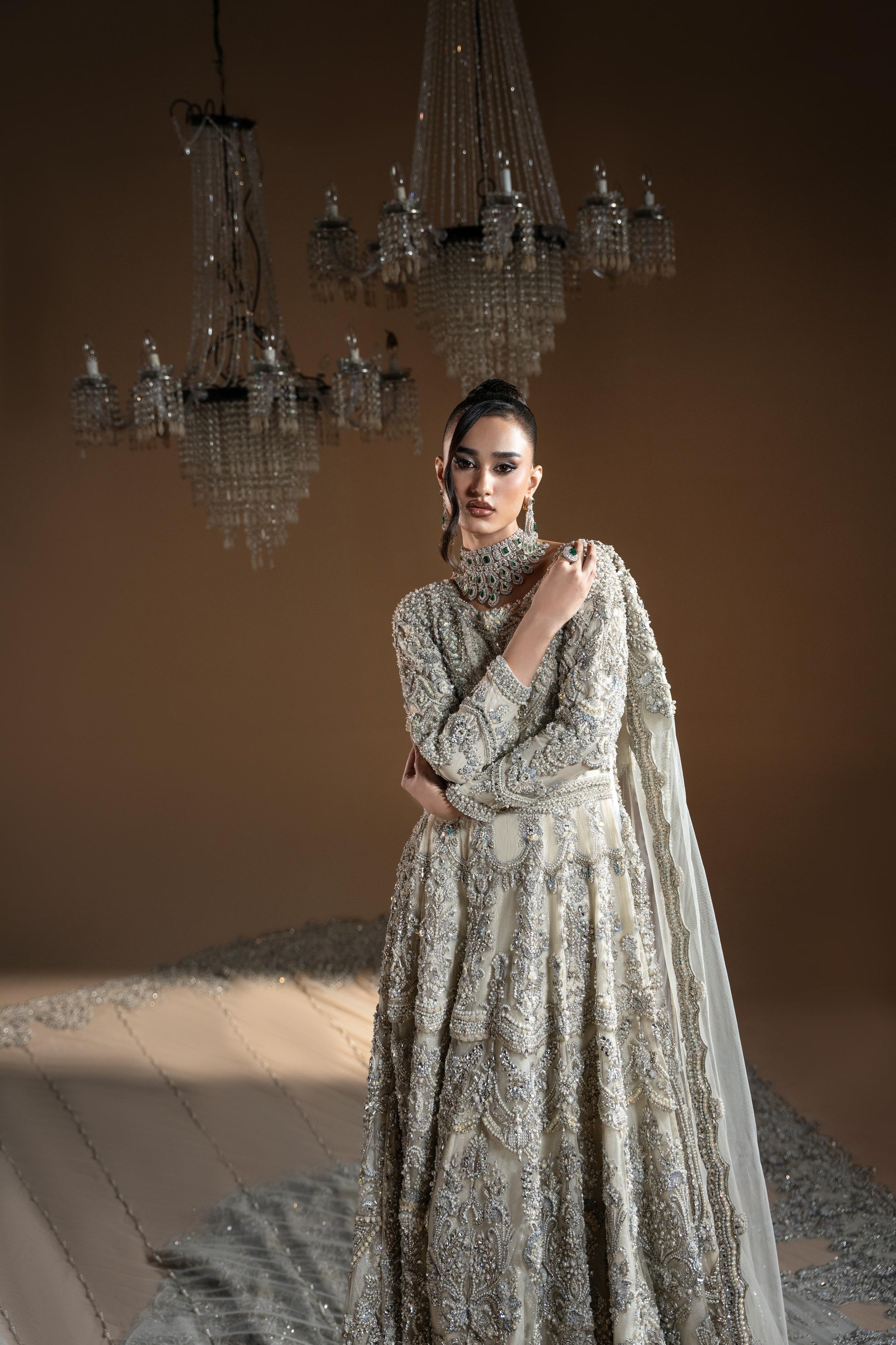 Pure net adorned with silver zari embroidery , adda work, sequins, naqshi , dabka heavily embellished with crystals and pearls. Lined with pure chiffon zari. Paired with heavily embellished net trail.