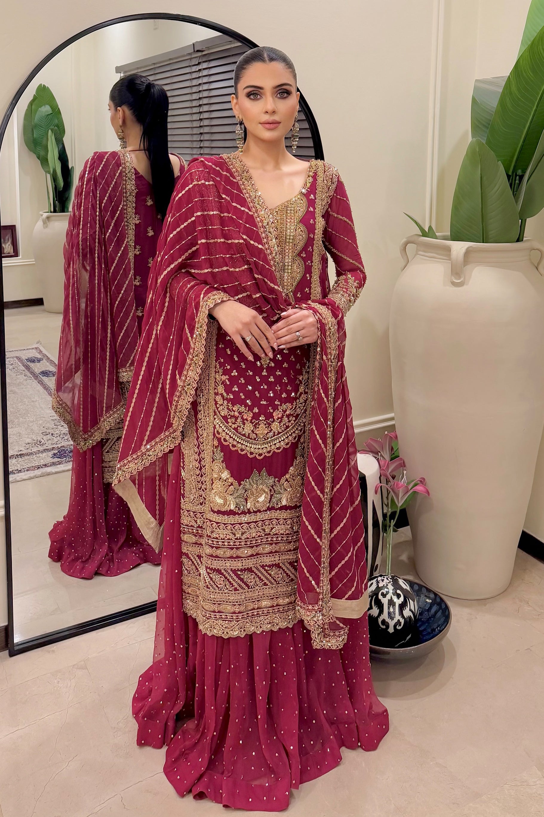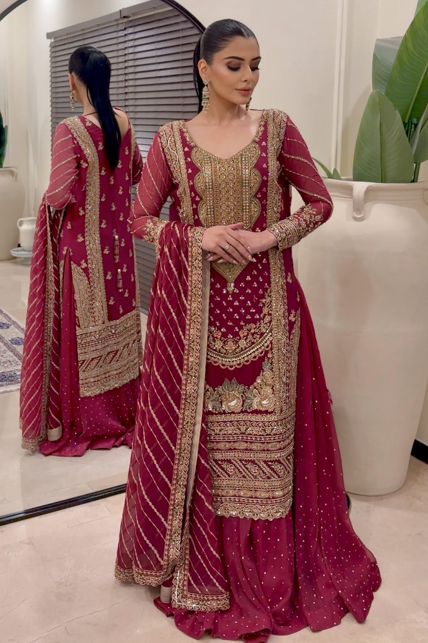 This masterpiece is a fusion of traditional craftsmanship and regal silhouettes. Drenched in a deep, sophisticated Magenta-Maroon hue, the outfit features intricate Antique Gold Zardozi-style embroidery, making it a timeless choice for a festive or bridal occasion.