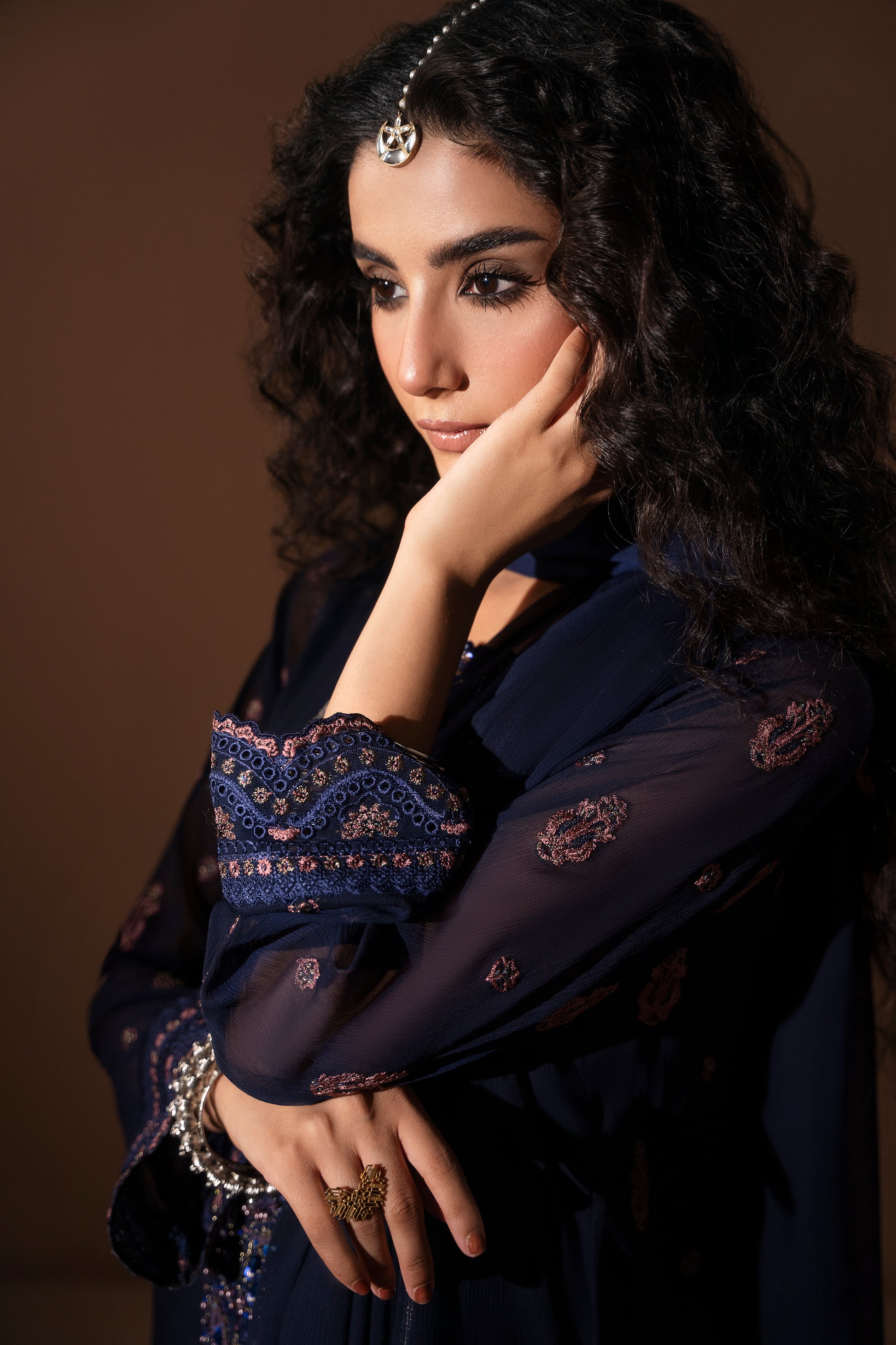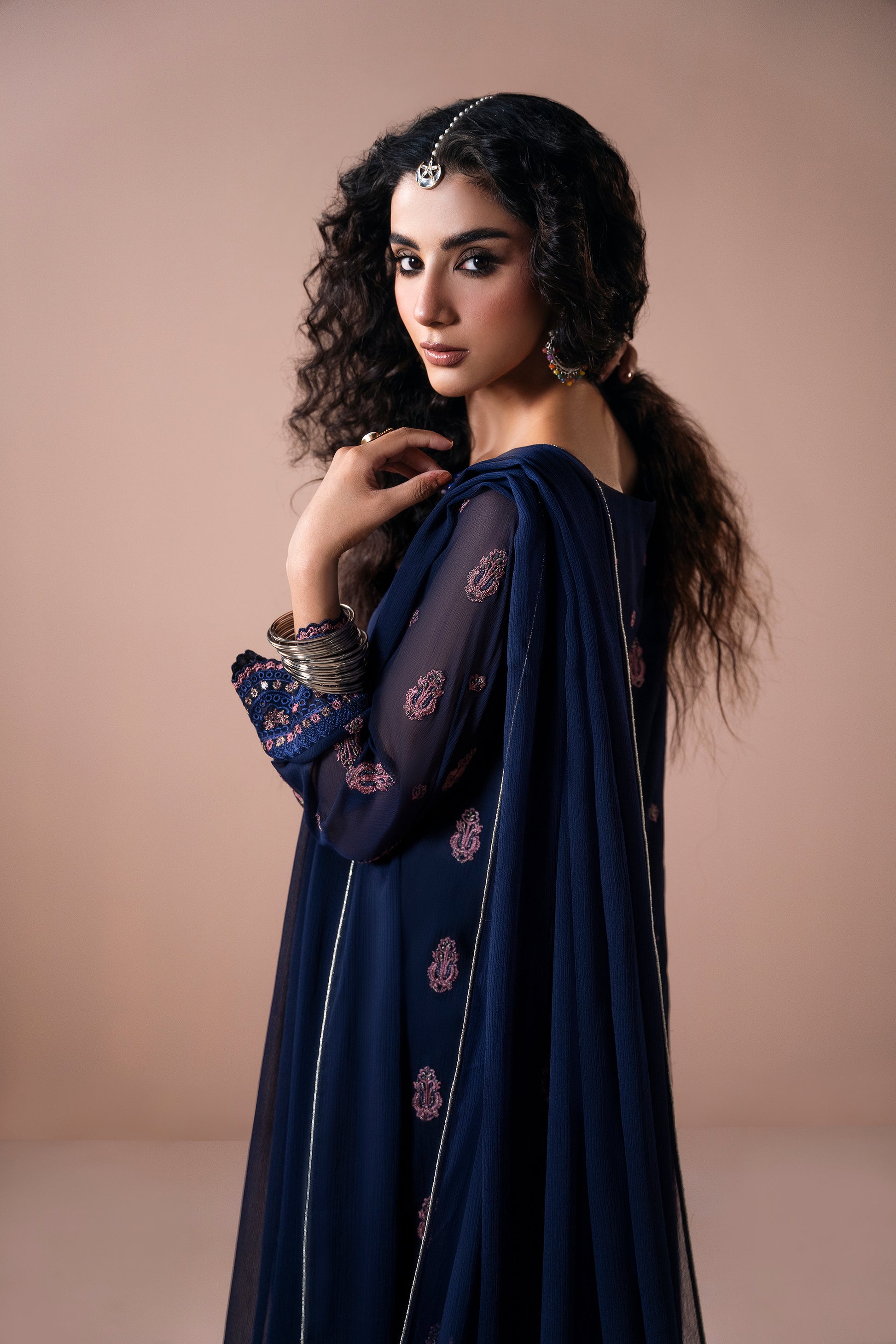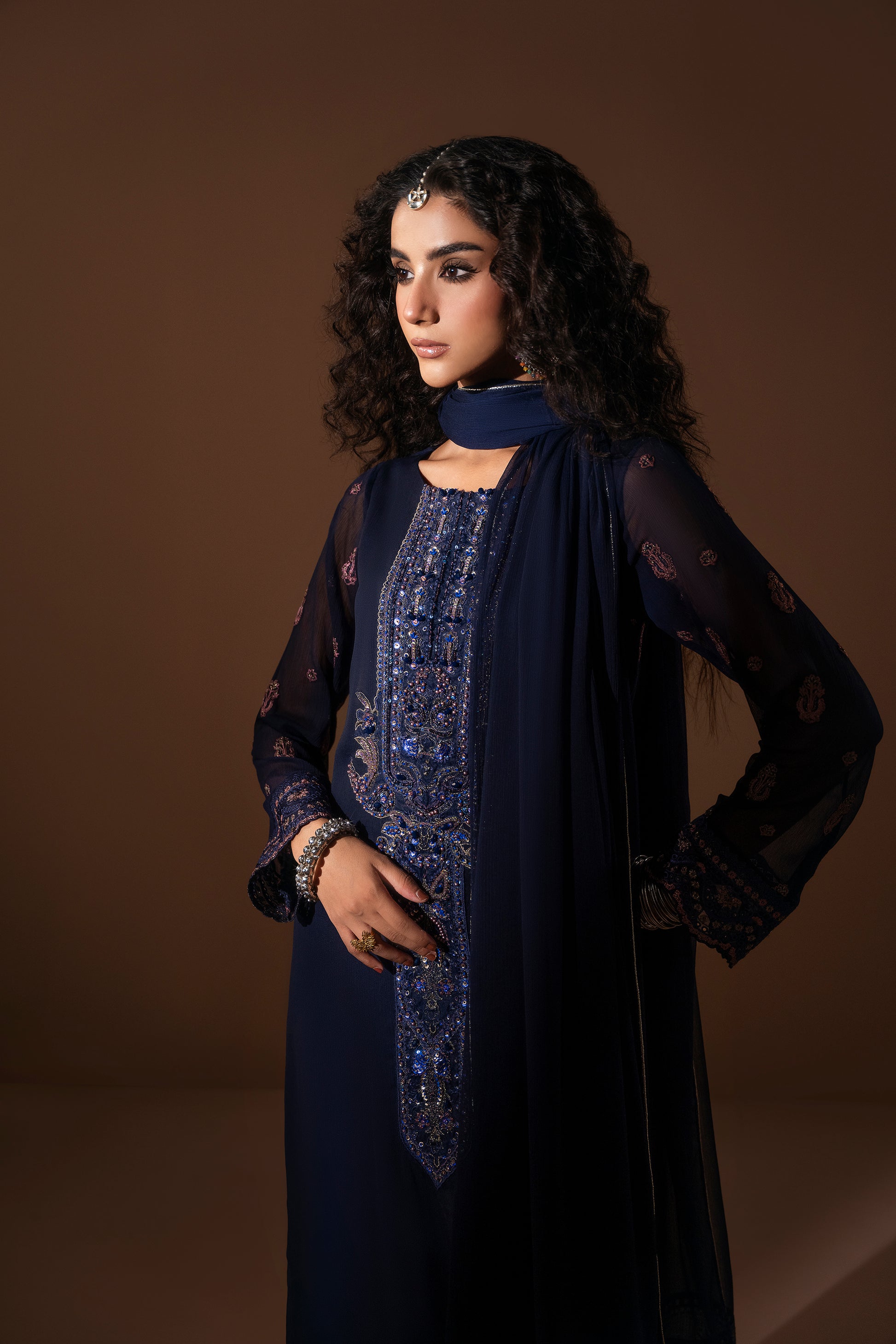 This premium chiffon long shirt features exquisite embroidery and embellishment, accentuated by a statement neckline for a refined look. The embroidered sleeves and back add depth and sophistication to the design. It is paired with PK silk A-line pants showcasing an embroidered border at the hemline, perfectly complementing the outfit. A plain chiffon dupatta with subtle embroidered borders at the pallu completes this elegant and timeless ensemble.