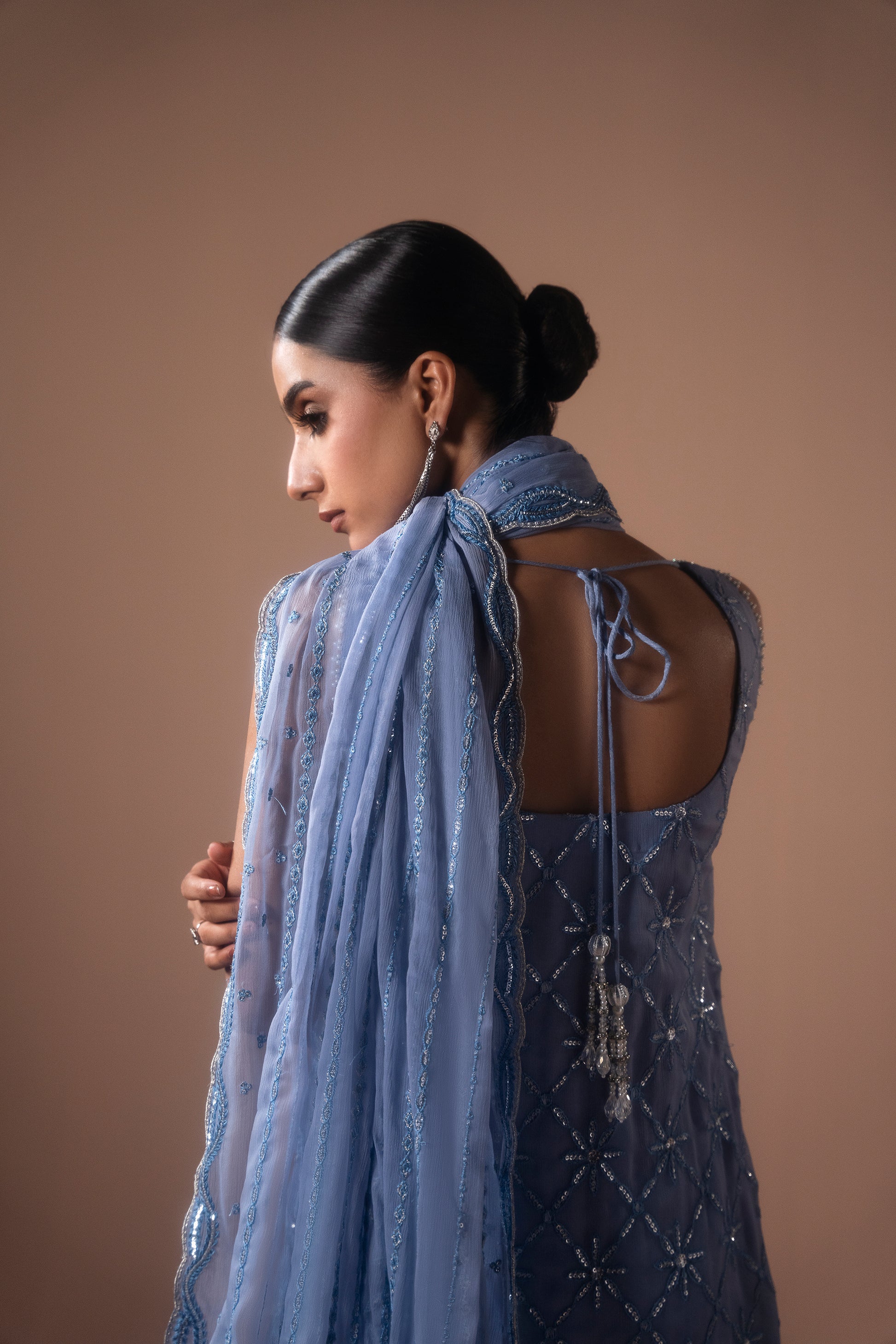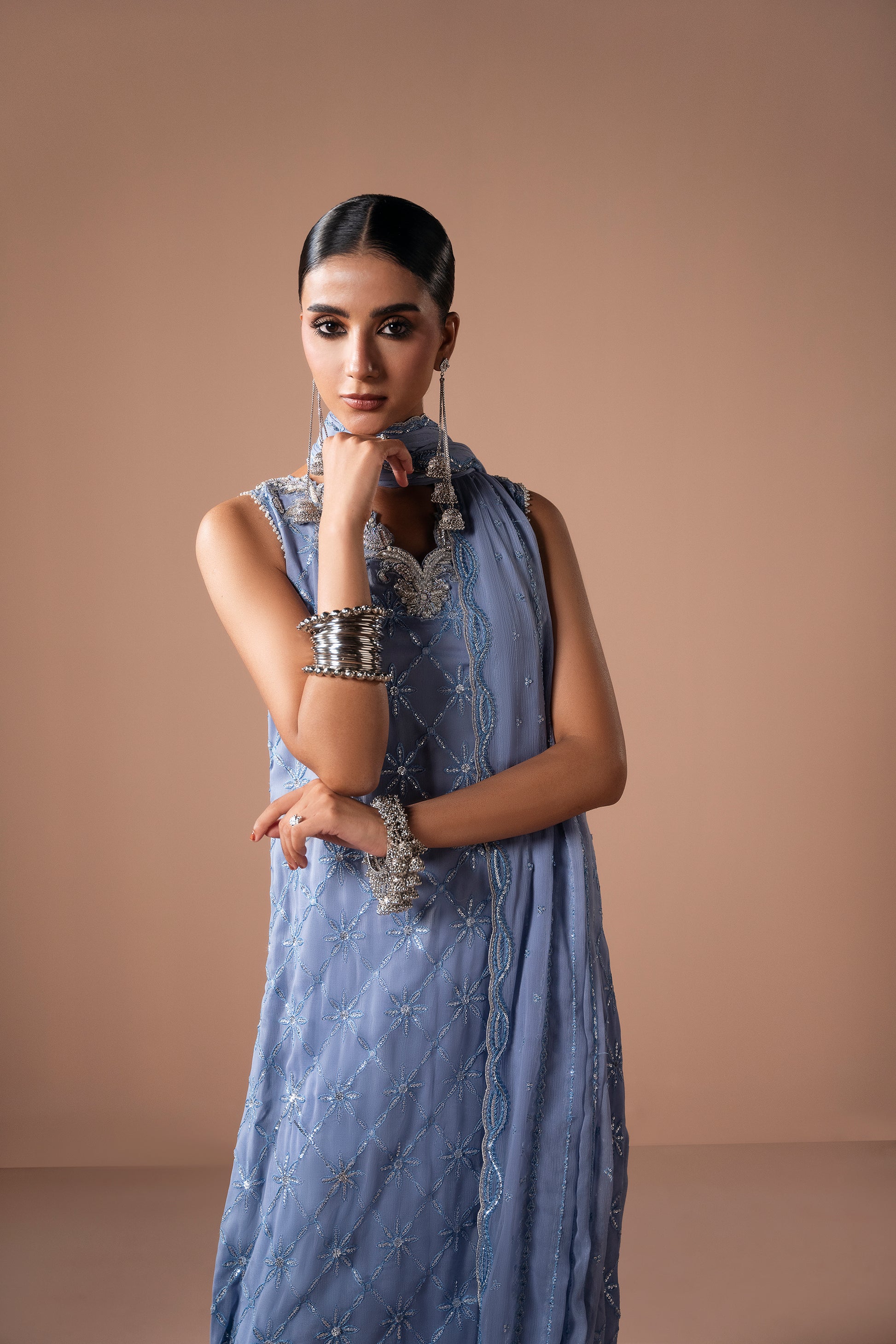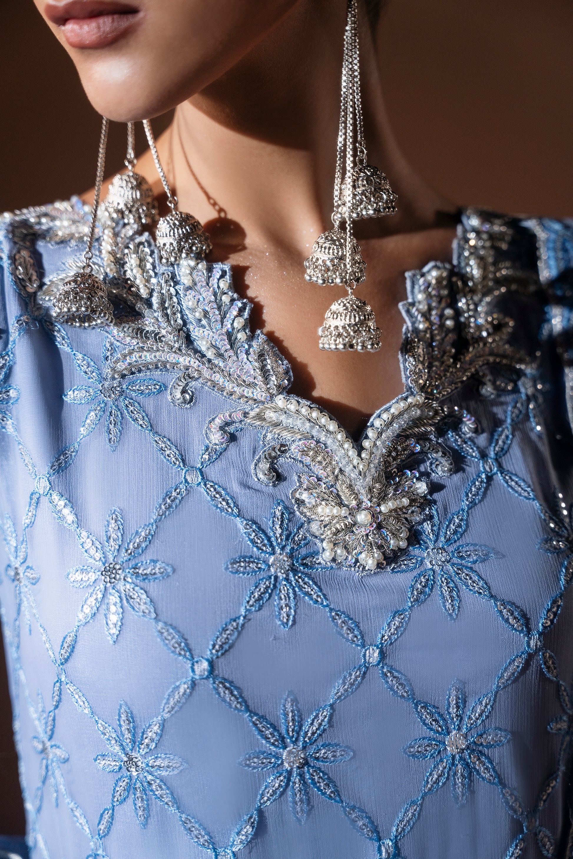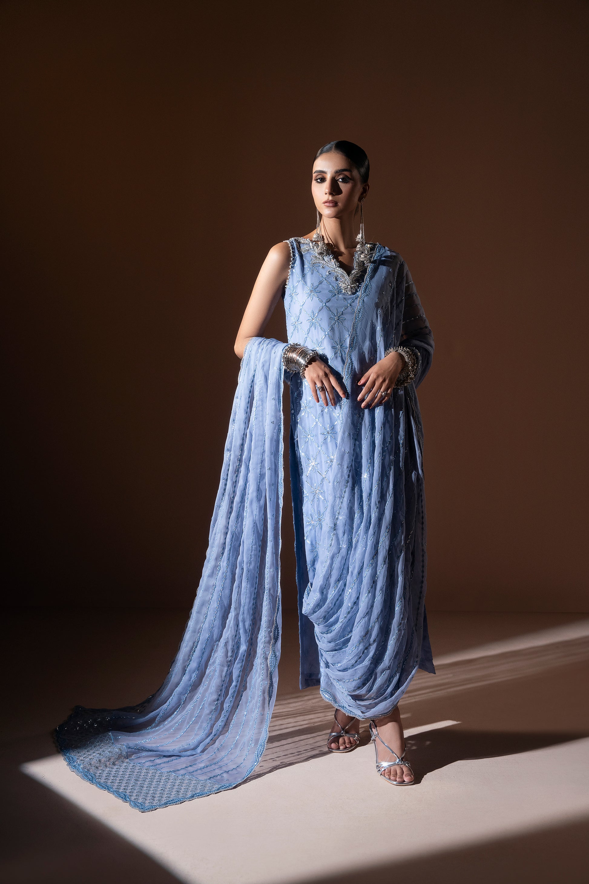 This all-over embroidered chiffon long shirt features a statement embellished neckline, exuding timeless elegance. The sleek silhouette is enhanced with a graceful dupatta drape and delicate tassel detailing at the back, adding a touch of sophistication. Paired with PK silk cigarette pants, this ensemble perfectly balances classic charm with contemporary finesse.