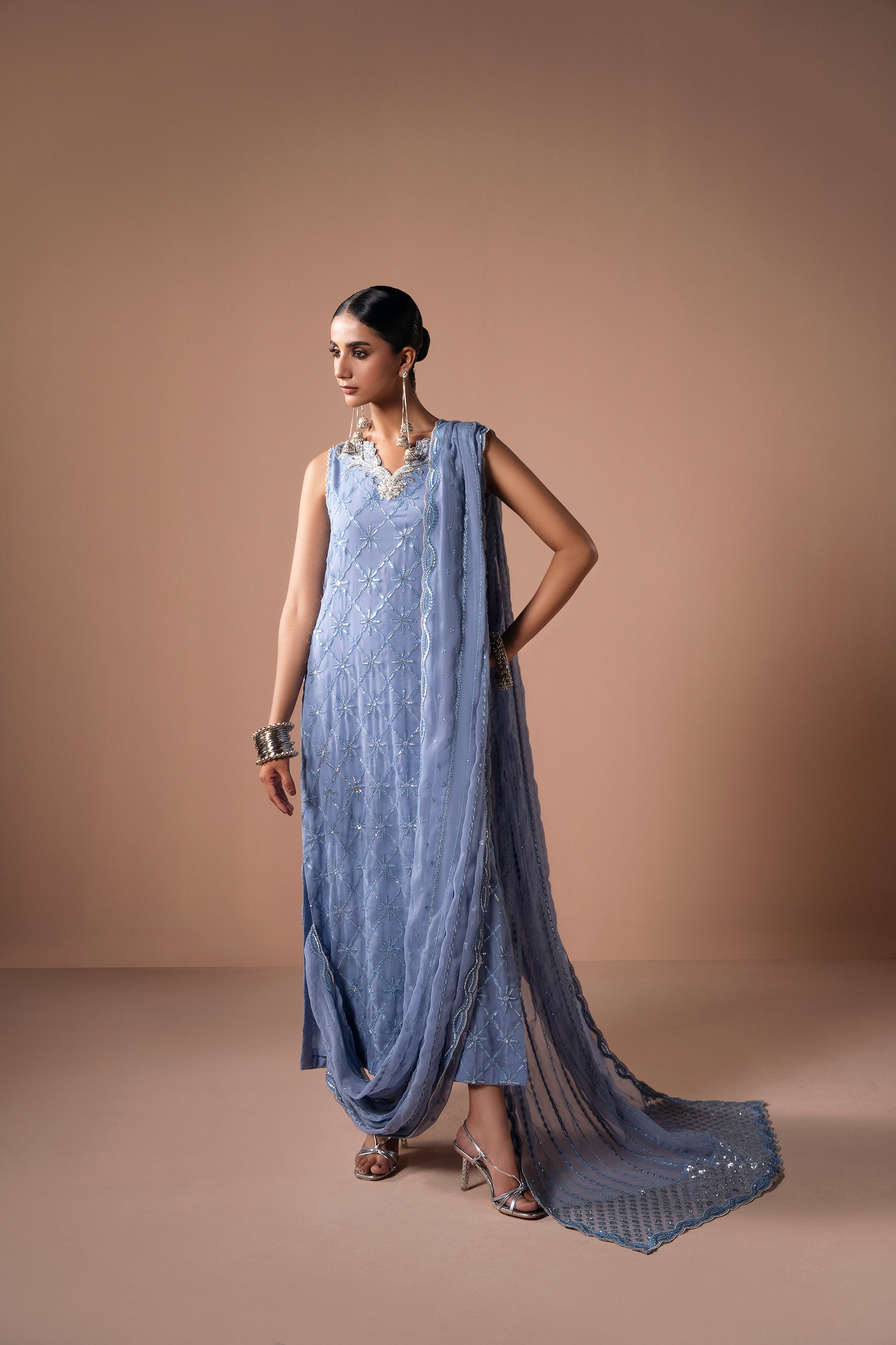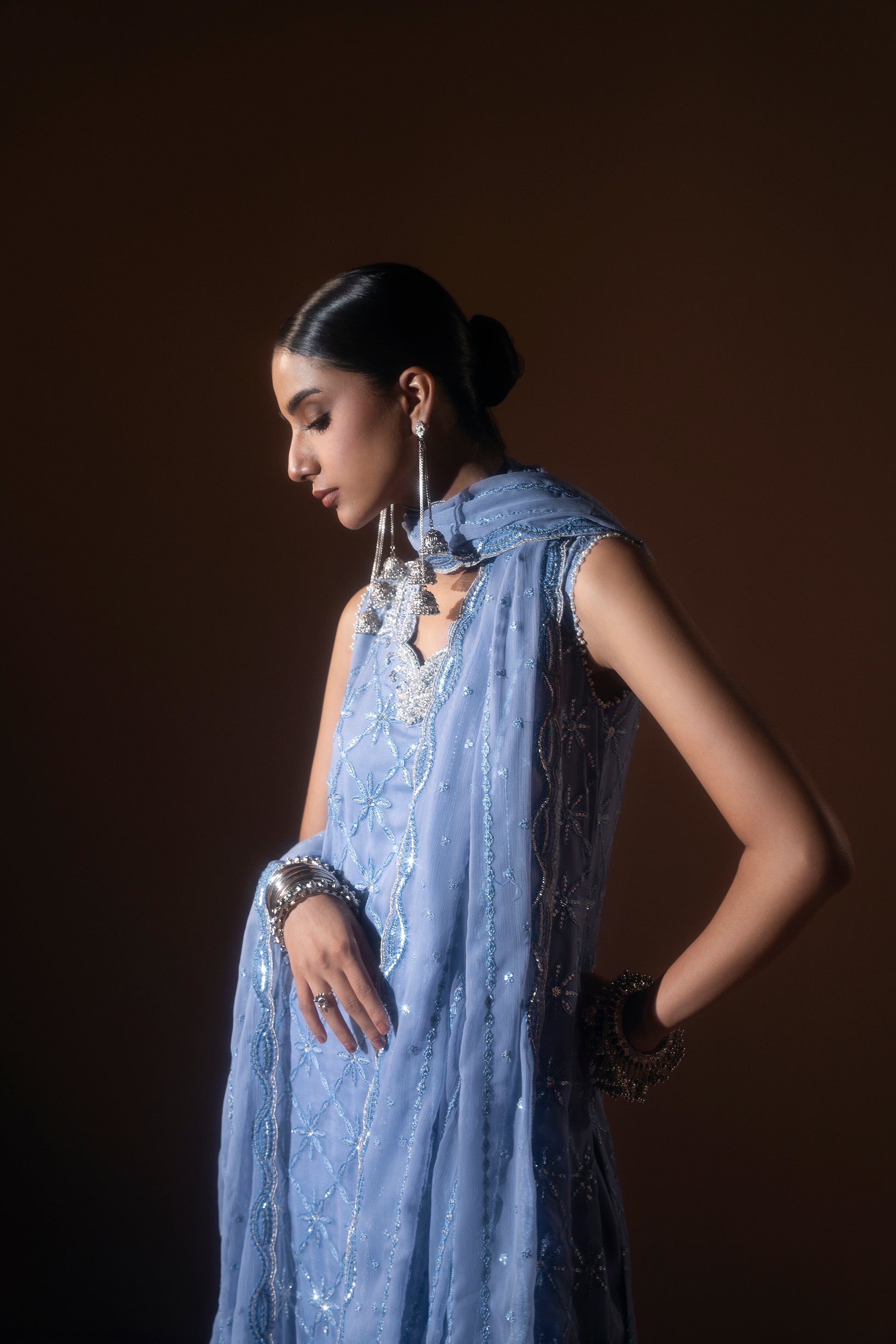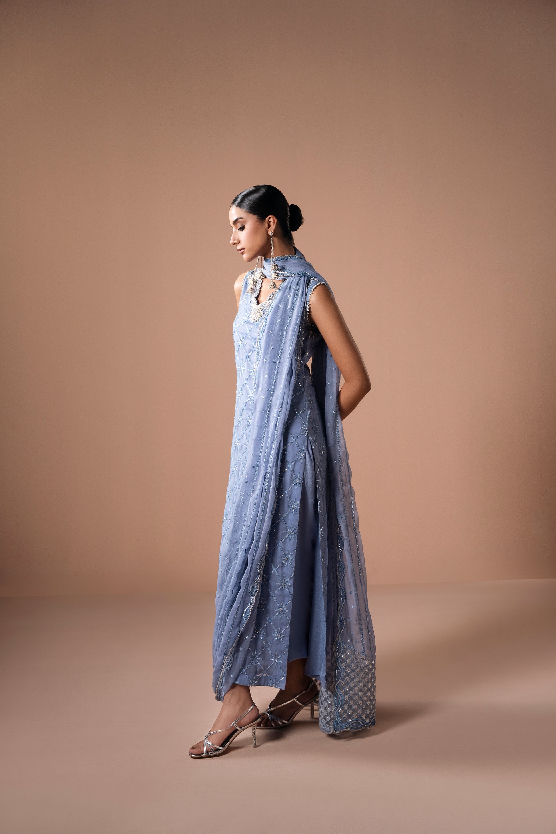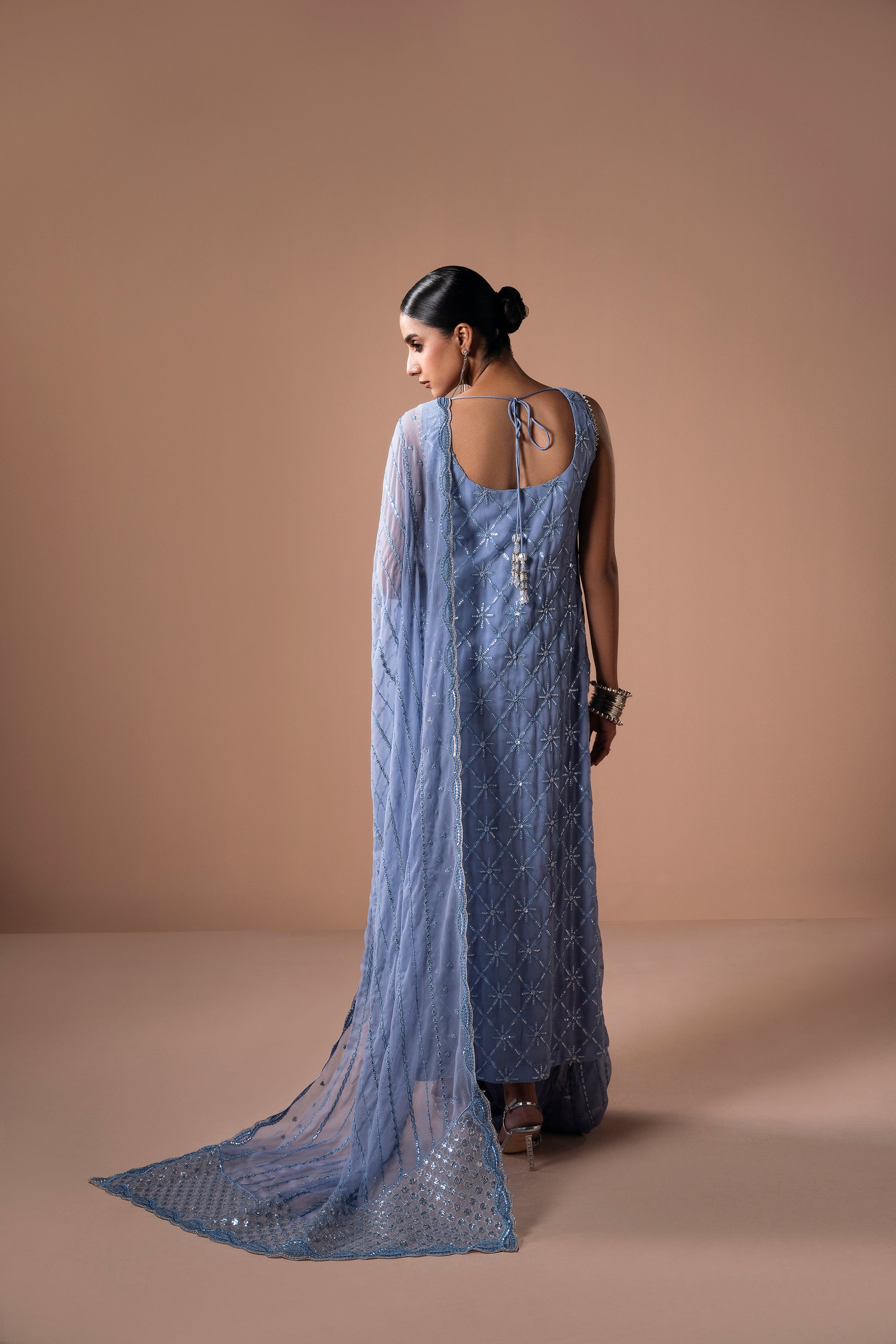 This all-over embroidered chiffon long shirt features a statement embellished neckline, exuding timeless elegance. The sleek silhouette is enhanced with a graceful dupatta drape and delicate tassel detailing at the back, adding a touch of sophistication. Paired with PK silk cigarette pants, this ensemble perfectly balances classic charm with contemporary finesse.