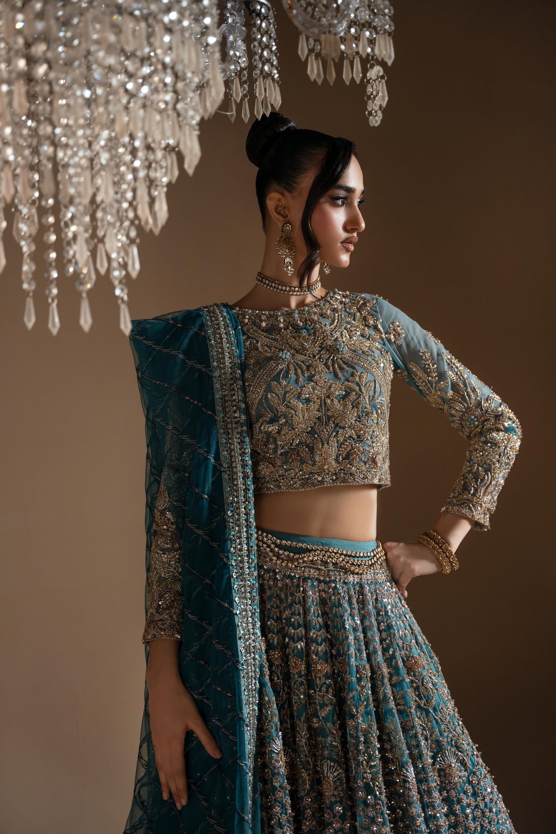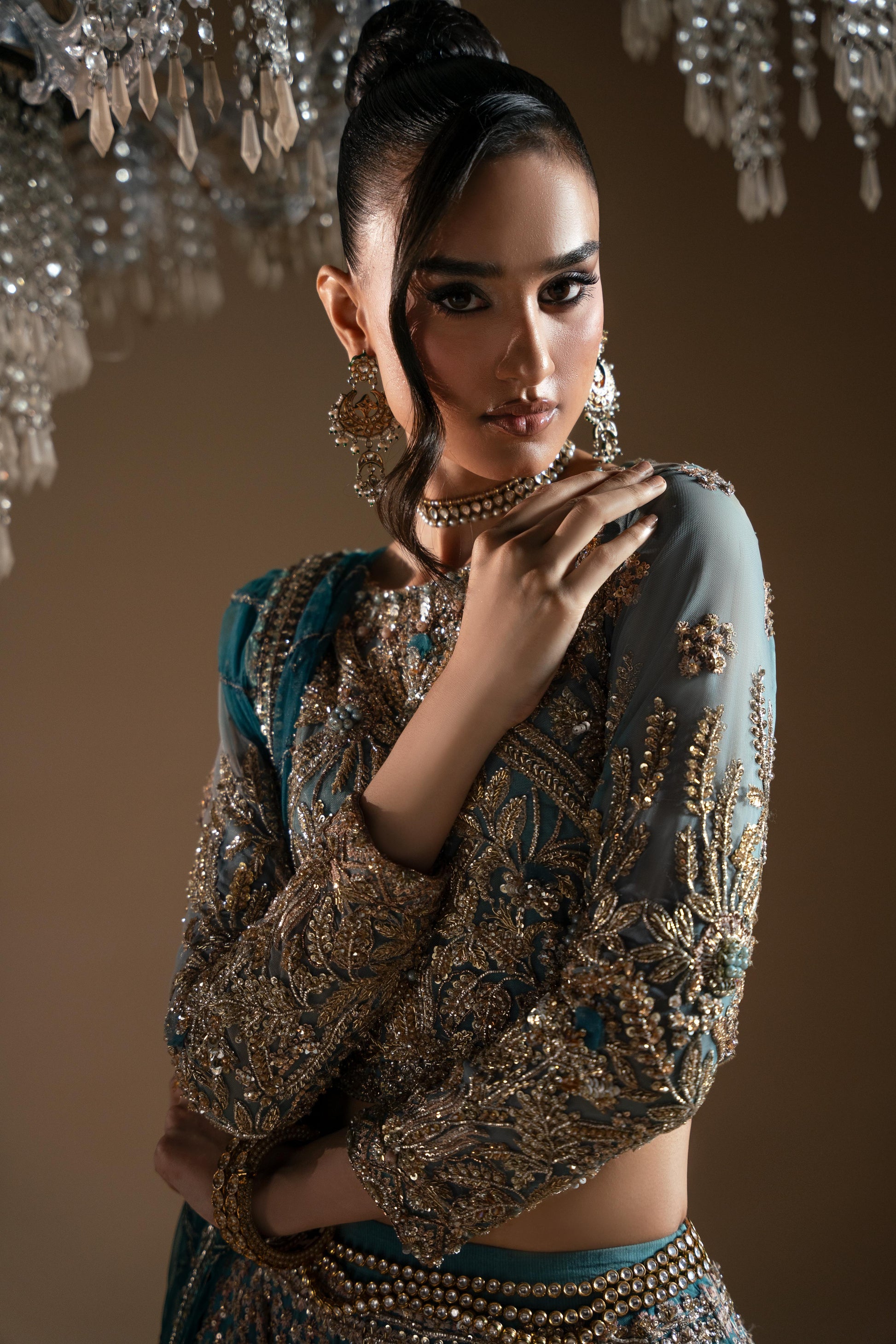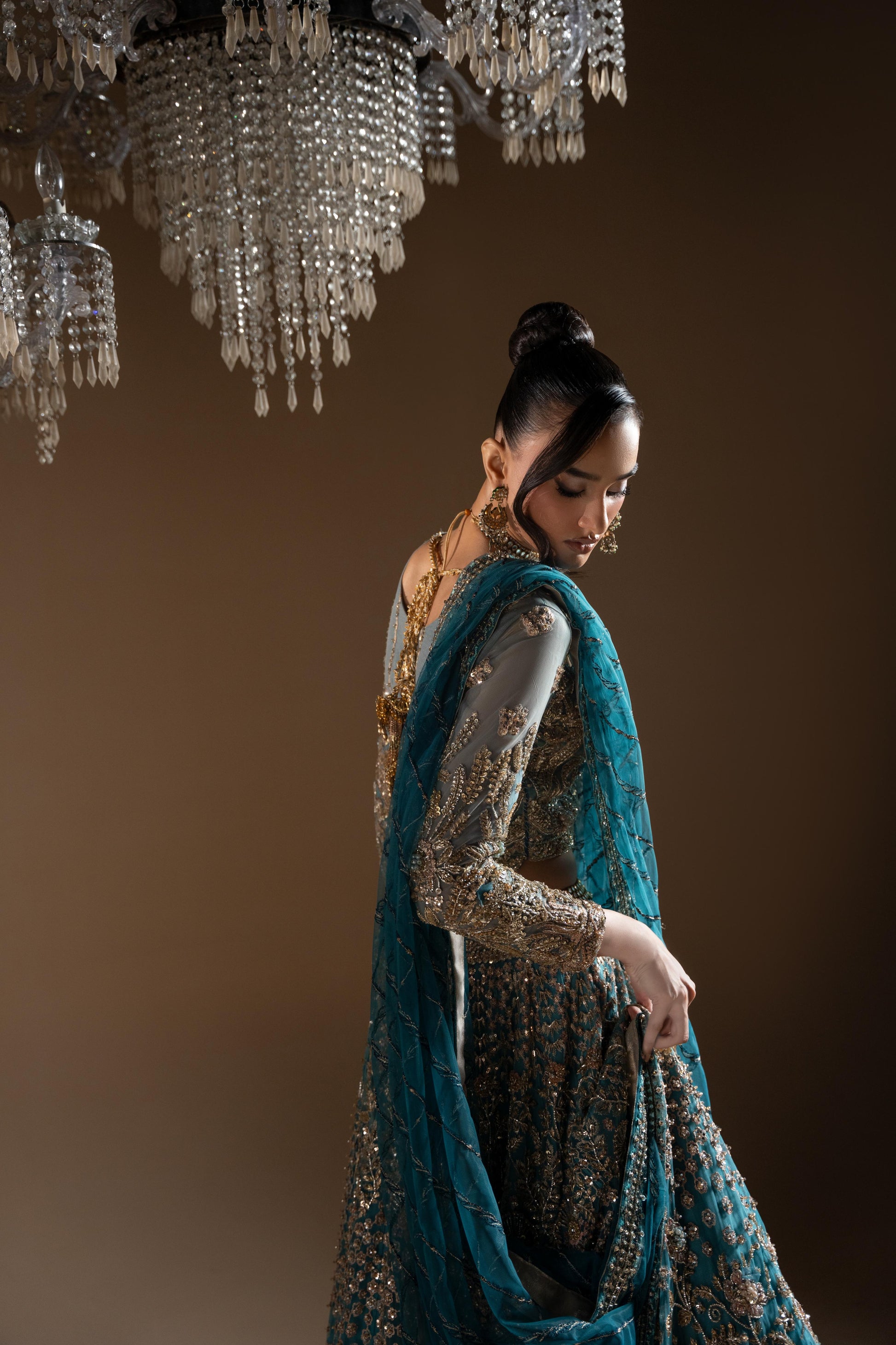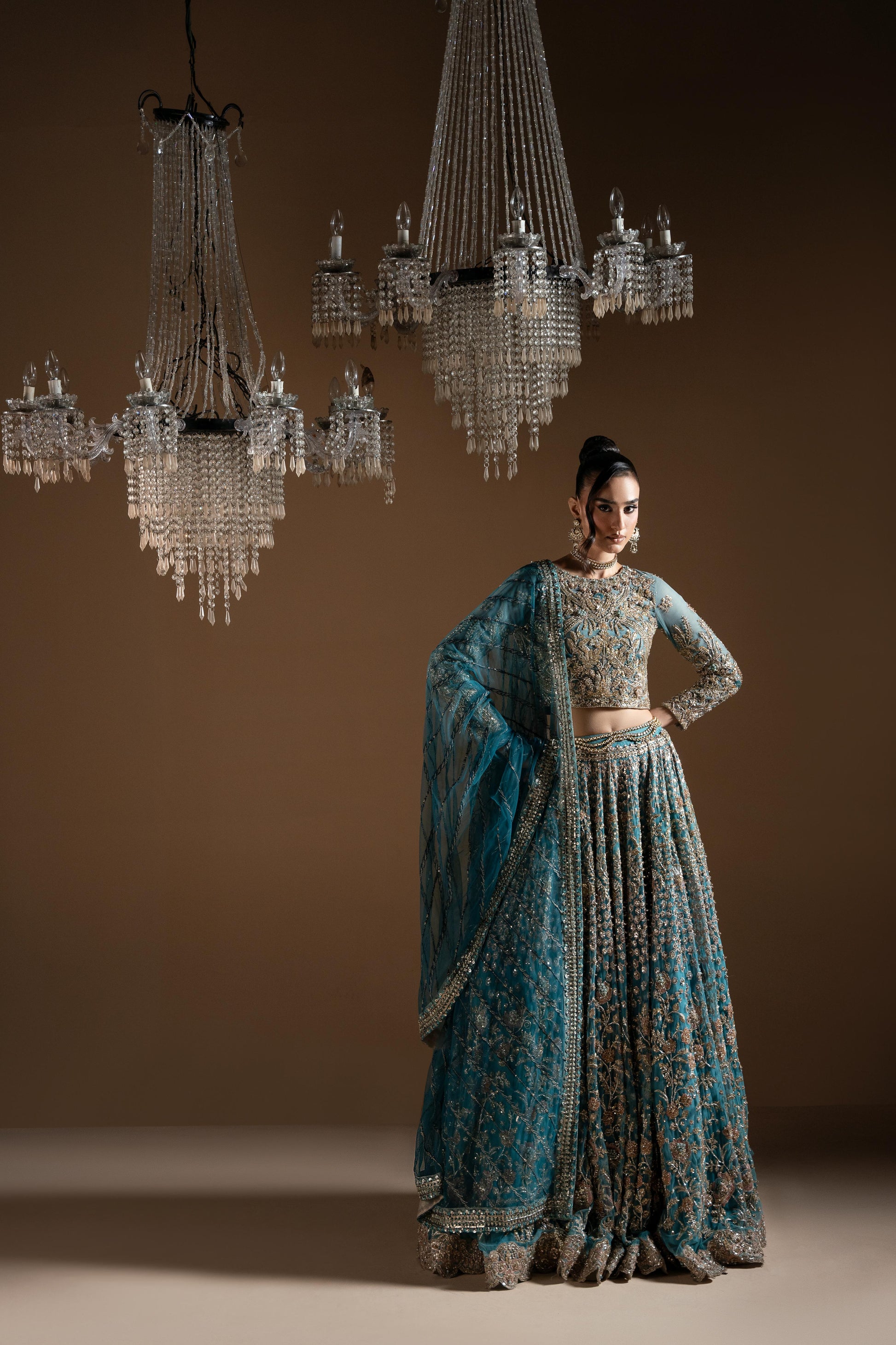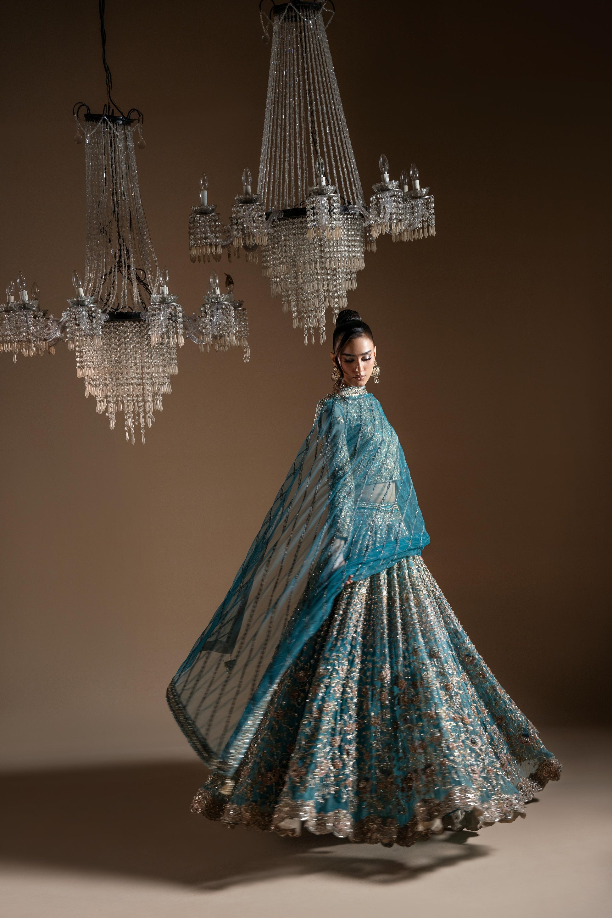 Pure net adorned with zari and resham embroidery , adda work, sequins, naqshi , dabka heavily embellished with crystals and pearls. Lined with premium silk. Paired with heavily embellished bordered dupatta with tassel details.